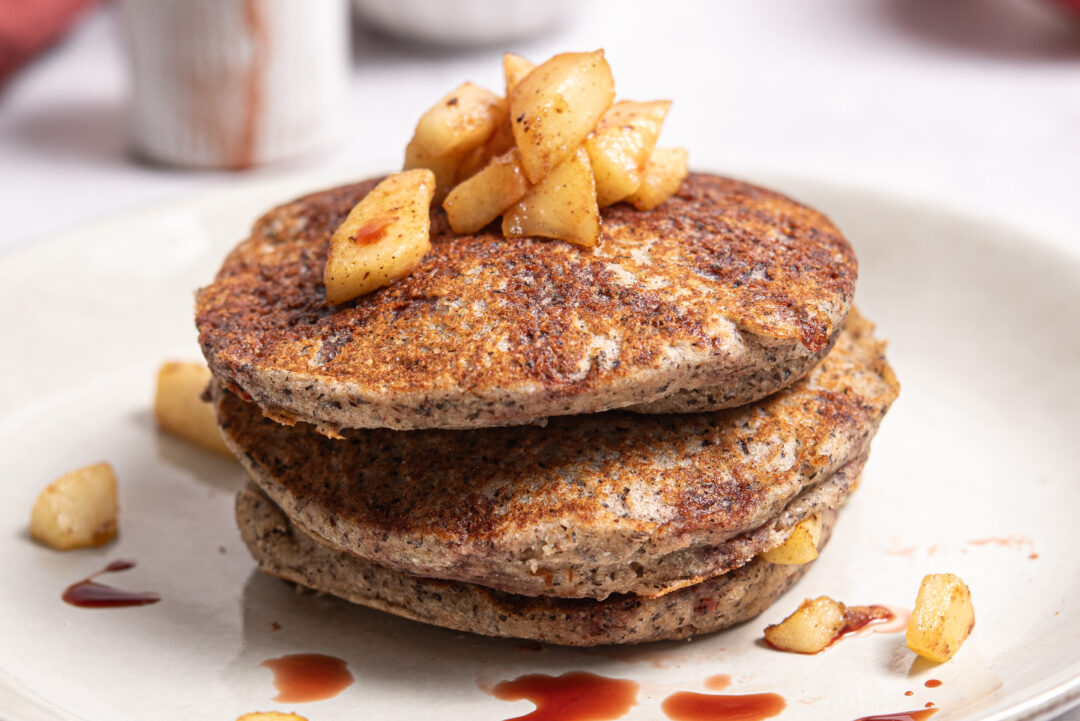 - Disponi la mela sopra i pancake e aggiungi un filo di sciroppo d’acero o di datteri.